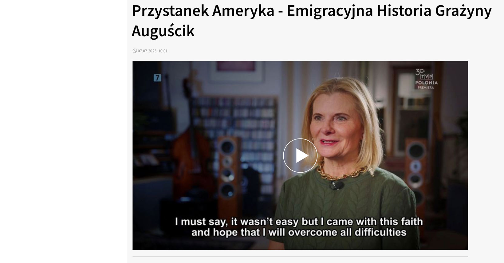 Najnowszy odcinek cyklu jest poświęcony historii wokalistki jazzowej Grażyny Auguścik. Od lat mieszka ona w Chicago. Koncertuje zarówno w Ameryce, jak i w Polsce.